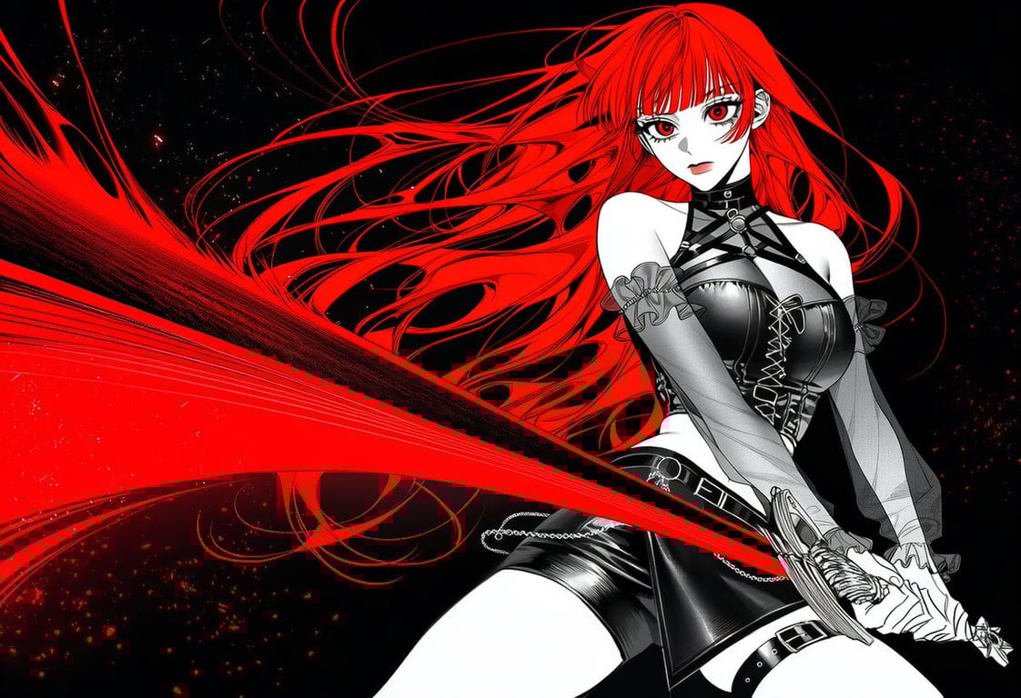 A prompt for generating a fantasy action scene with a focus on a large weapon and dramatic lighting. It uses specific weighting (::1.5:: and ::1.8::) to emphasize a black background, cel shading, chiaroscuro, and a red weapon trail, creating an intense, stylized combat image.