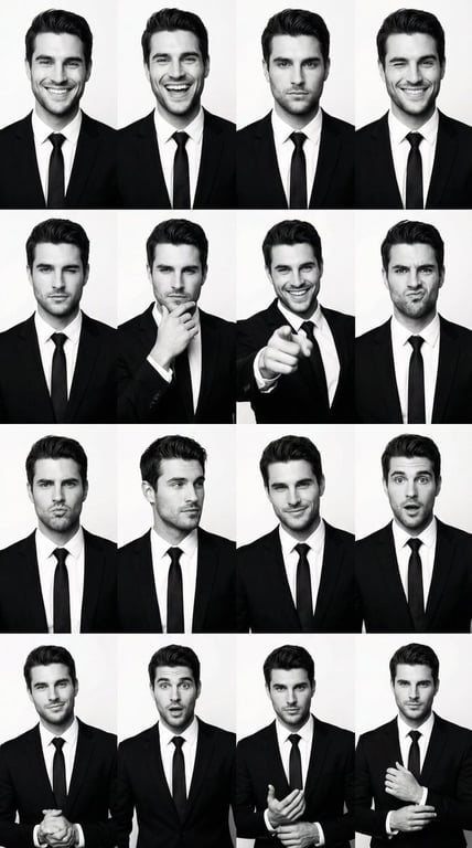 A highly technical, structured prompt for an image-to-image identity swap task, generating a 4x4 black and white grid. The prompt instructs the model to replace the identity in the reference grid image with a new target identity while strictly preserving the original poses, expressions, layout, and wardrobe (suit-and-tie).