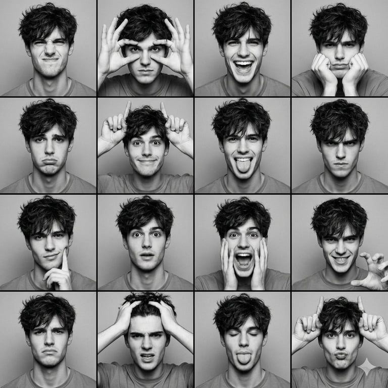 A highly structured prompt for generating a 4x4 grid of black-and-white photobooth images featuring a young man with 16 distinct facial expressions. The prompt requires using a reference image for identity preservation and specifies classic photobooth aesthetics, lighting (direct flash), and camera settings.