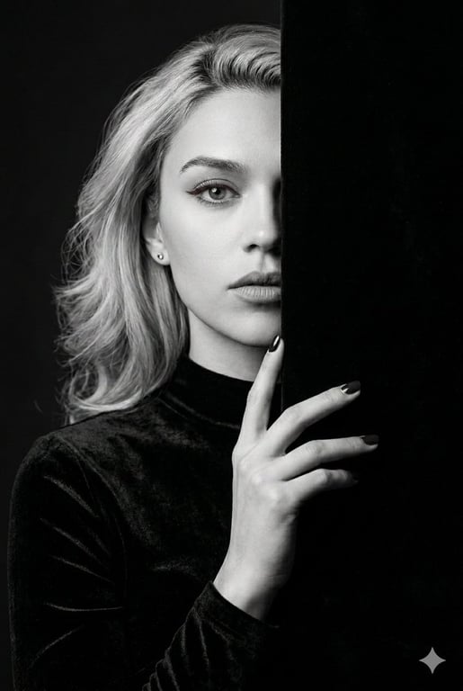 A highly detailed prompt for generating a black and white portrait in a dark studio setting, emphasizing hard directional lighting (Rembrandt style) and strict preservation of the subject's facial features, asymmetry, and physique based on a source photo.