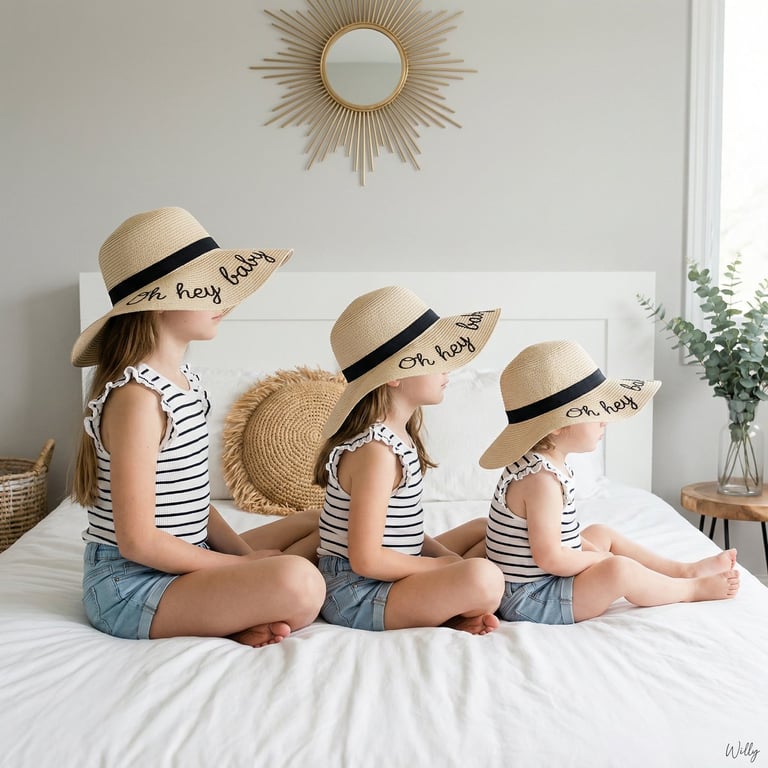 A detailed prompt for generating a lifestyle family photograph featuring three young sisters of different heights sitting side-by-side on a bed, all wearing matching outfits and oversized floppy hats that cover their faces. The prompt specifies composition (side profile, height difference), environment (bohemian bedroom), and requires the AI to render a specific cursive text on the hats and a handwritten signature in the corner.