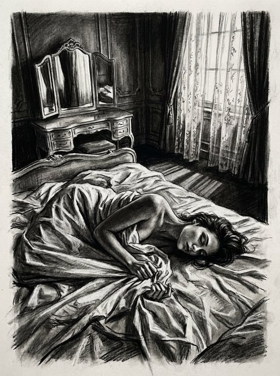 A short style prompt for generating a boudoir portrait that looks like a charcoal sketch in high resolution, suitable for intimate artistic portraits.