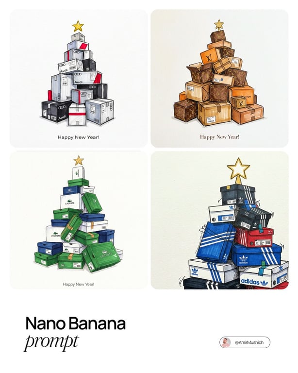 A highly detailed prompt for generating a hand-drawn fashion illustration of a Christmas tree constructed from a chaotic stack of branded product boxes. It specifies composition, strict adherence to the brand's color palette and typography, and an 'Alcohol Marker and Ink' sketch art style on a white paper background.