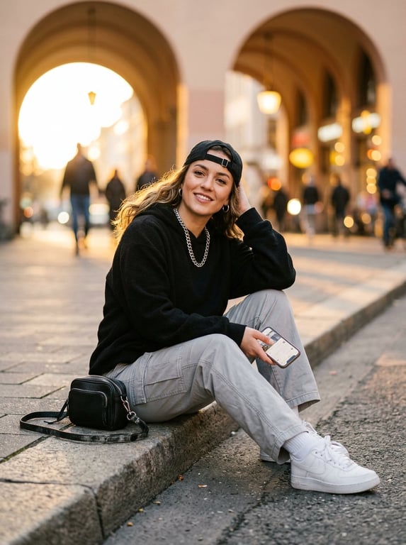 A detailed prompt for generating an editorial-style, ultra-detailed image of a young woman in street fashion sitting on a city sidewalk curb at sunrise, utilizing specific clothing and lighting details for Nano Banana 2.