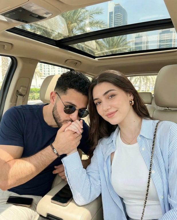 A highly detailed JSON prompt for generating a candid lifestyle photograph of a couple in a car interior during the daytime. The prompt specifies the subjects' clothing, poses (hand-kissing gesture), lighting conditions (soft daylight through the sunroof), and technical details to achieve a warm, aspirational social media aesthetic.