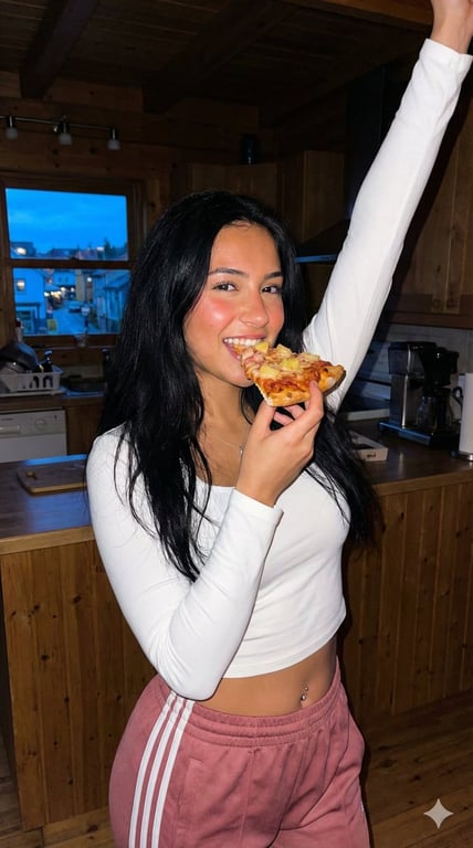 A detailed JSON prompt for generating a candid, energetic lifestyle shot of a young woman eating pizza, utilizing direct on-camera flash lighting to create high contrast and hard shadows, mimicking the Gen Z influencer snapshot aesthetic.