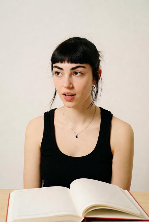 A prompt for generating a candid, high-resolution medium shot of a young woman sitting at a light wood table. It specifies minimalist aesthetics (solid off-white wall), simple attire (black tank top), and soft, even studio lighting to capture a natural, mid-expression moment with an open notebook.