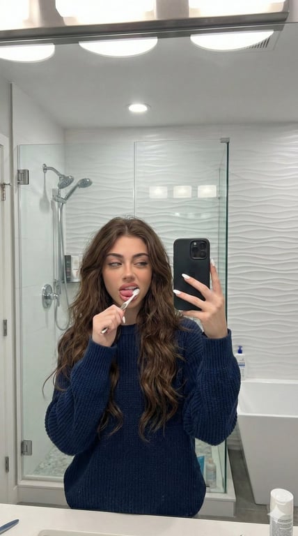 A detailed, structured prompt designed for image generation models to create a realistic, candid mirror selfie of a young woman brushing her teeth in a modern bathroom setting. The prompt specifies lighting, background elements, composition, color profile, technical specs, and the subject's actions and attire, resulting in a highly specific and reproducible image.