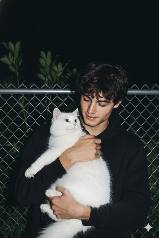 A prompt for generating a raw, candid nighttime smartphone photo featuring a man holding a large white cat, utilizing a bright direct camera flash for a high-contrast, slightly grainy aesthetic reminiscent of early 2010s digital photography.