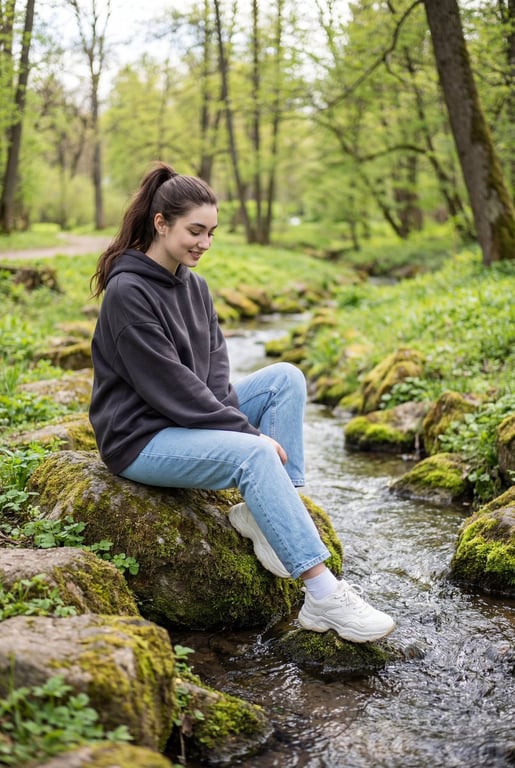 An ultra-realistic lifestyle portrait prompt of a young woman sitting on a rock beside a small flowing creek in a lush green park, emphasizing candid photography style, natural daylight, and detailed textures.
