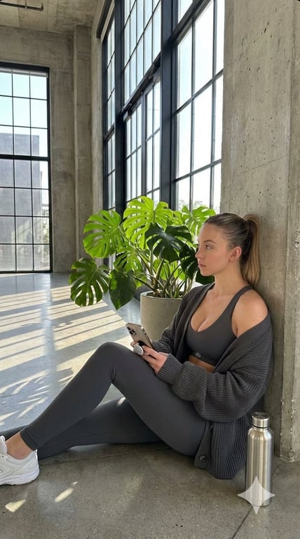 A structured prompt designed to generate a candid, high-fashion image of a model resembling Kendall Jenner post-workout, emphasizing hyper-realistic skin texture, dramatic HDR lighting, and a minimalist, brutalist architectural setting.