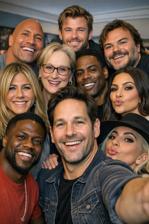A simple image prompt for generating a photo of celebrities taking a selfie, specifically featuring Paul Rudd in the center, focusing on the resulting image without showing the phone or framing.