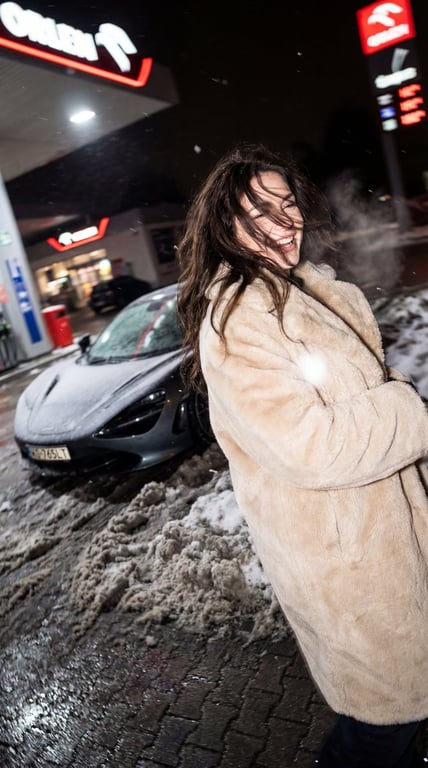 A highly detailed JSON prompt designed to simulate raw, chaotic mobile flash photography in a winter nightlife setting. The scene features a woman in a fur coat next to a McLaren at a Polish gas station, emphasizing extreme digital noise, motion blur, and harsh flash falloff for an 'accidental aesthetic'.