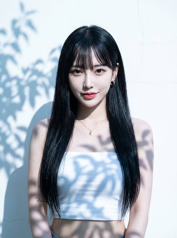 The first step in a multi-step process, this prompt is designed to generate a high-resolution (4K recommended) image of a main character, focusing on composition, high-contrast lighting, and detailed facial features of a young Japanese woman with a K-pop idol aesthetic.