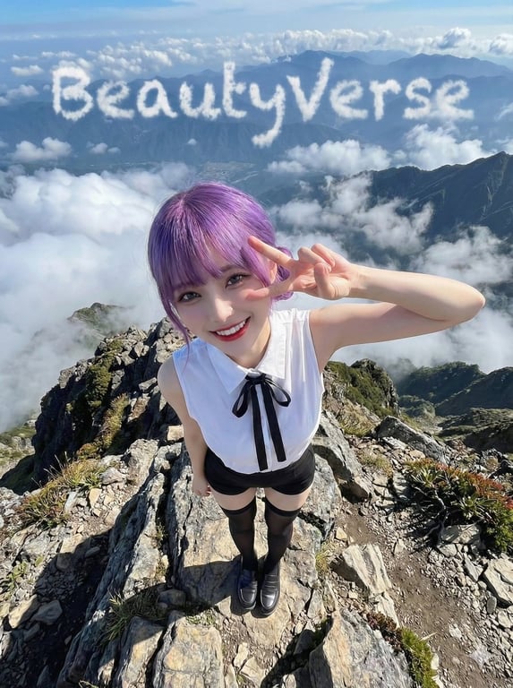 A structured JSON prompt designed to place a character (with strict identity lock from a reference image) on a high mountain peak. The prompt uses an extreme high-angle, wide-angle view and specifies that the background clouds should form customizable text, creating a dramatic, stylized effect.