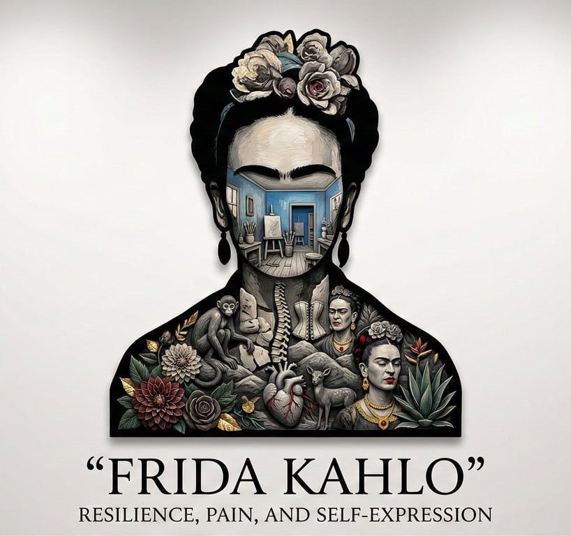 A conceptual prompt for generating an image where a bold, minimalist silhouette of a character is filled with a miniature, layered bas-relief world representing their narrative, key moments, and emotional beats. It emphasizes sculptural storytelling, monochrome palette with selective accents, and a pure white gallery background.