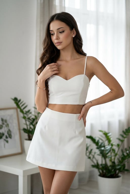 A detailed image generation prompt for Google Gemini Nano Banana Pro 3.0, creating an ultra-realistic fashion photograph of a young woman in a white cropped tank top and a-line mini skirt, set in a bright, modern studio with soft, diffused natural lighting, aiming for a clean, sophisticated, and chic aesthetic.