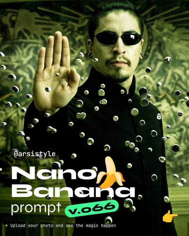 A detailed prompt (v.066) for Nano Banana to generate a cinematic, high-contrast image. It specifies a medium eye-level shot of a subject in a black long coat making a stopping gesture, with metallic projectiles suspended in the foreground and a dark, ornate background, rendered with a monochromatic green wash and 35mm film grain.