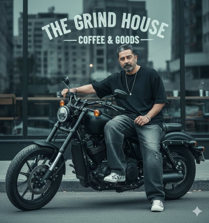 A prompt for generating a cinematic, full-body portrait of a young male biker on a black cruiser motorcycle. It emphasizes edgy street style attire, a moody teal-gray color grading, gritty textures, and high-contrast shadows, aiming for a rebellious 35mm film photography aesthetic in an urban setting.