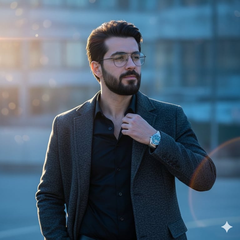 A highly detailed, structured prompt for generating an ultra-realistic cinematic portrait of a man during blue hour. It emphasizes a poetic and romantic mood, soft blue ambient light contrasted with warm dappled backlight, and technical details like shallow depth of field and cinematic HDR grading.
