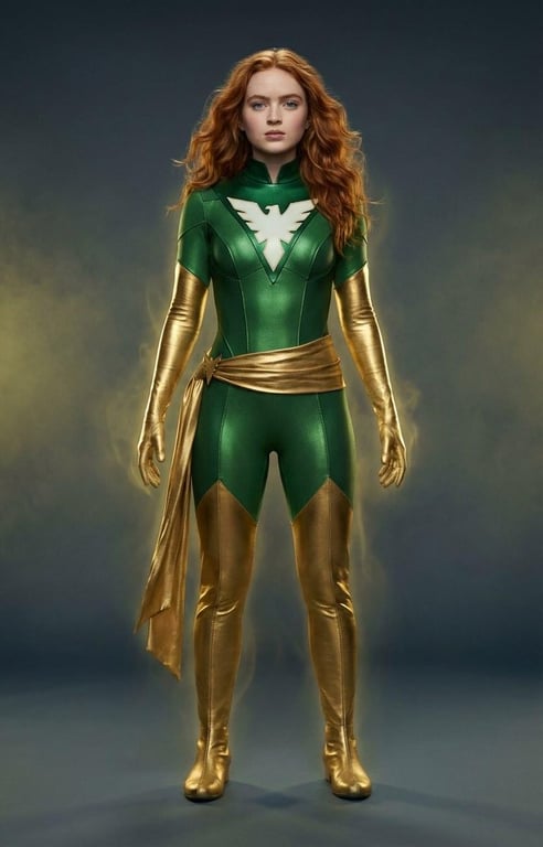 A structured JSON prompt for generating a cinematic 3D render or concept art of actress Sadie Sink portraying the Marvel character Jean Grey, detailing three distinct costume variants, specific physical features, and technical rendering parameters like 4K resolution and Unreal Engine 5 style.