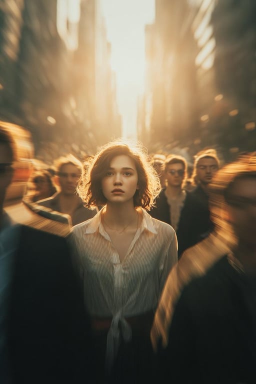 A prompt for generating a cinematic conceptual portrait of a woman in an urban crowd, using extreme radial motion blur and dynamic speed distortion to convey psychological tension and existential solitude.