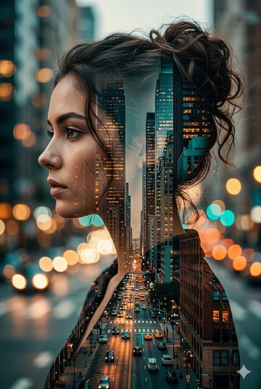 A prompt for Google Gemini Nano Banana Pro to create a cinematic double exposure portrait of a young Hollywood actress, overlaying her profile with a busy city street scene, using warm orange and teal tones.