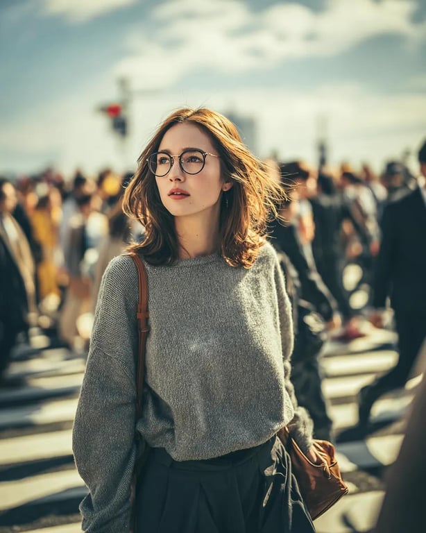 A detailed prompt for generating a candid, ultra-realistic cinematic portrait of a stylish young woman in a busy city crosswalk during golden hour, emphasizing shallow depth of field, creamy bokeh, and film photography aesthetics.