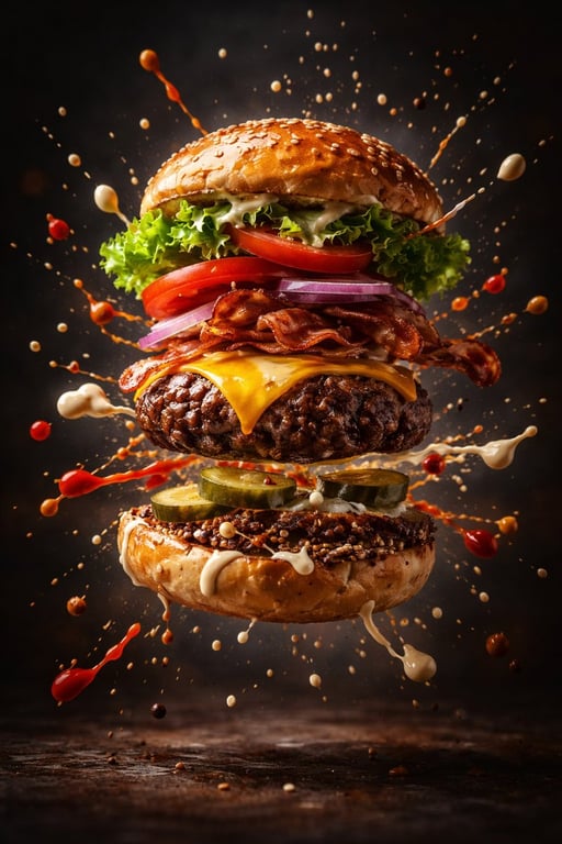 A highly structured, code-like prompt using Python syntax (importing physics and lighting modules) to generate a cinematic advertising image of a gourmet burger exploding in slow motion, detailing ingredients, textures, and studio lighting setup.