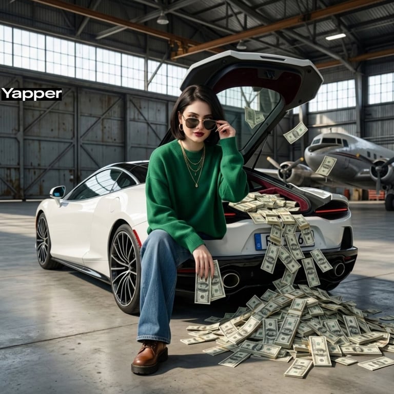 A prompt for generating an ultra-realistic cinematic photo of a confident, stylish woman standing in an industrial aircraft hangar next to a luxury sports car overflowing with stacks of cash, using soft cinematic lighting and high-end editorial style.