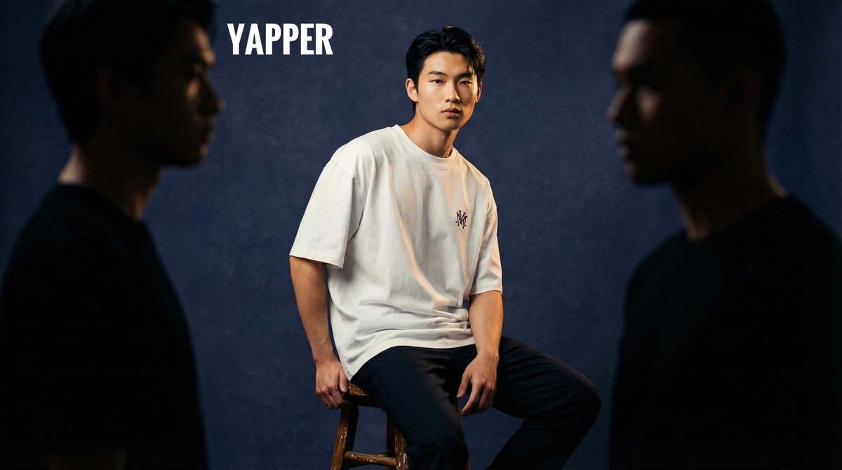A detailed image generation prompt for Nano Banana Pro describing a cinematic, high-fashion studio photoshoot featuring a Gen-Z male model seated centrally, framed by two blurred shadowy figures, set against a moody dark blue background with dramatic, editorial lighting.