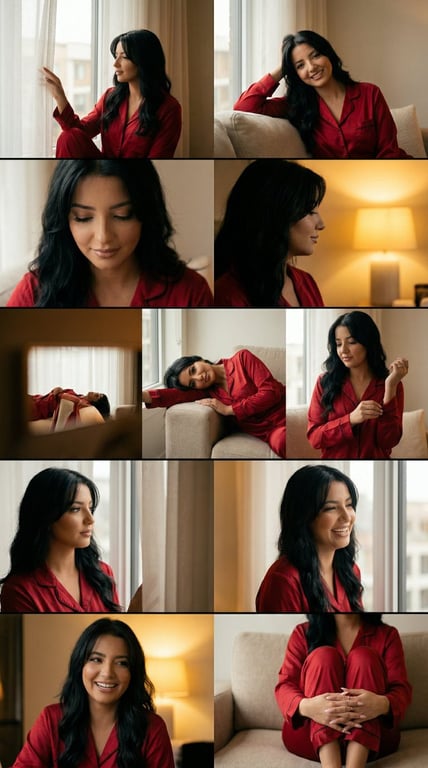 A highly structured prompt for generating a 3x3 cinematic editorial grid featuring the same woman in various relaxed poses wearing luxury red silk pajamas. It specifies warm, intimate lighting (soft window light + warm lamp), a shallow depth of field (50mm lens, f1.8), and a list of nine specific pose variations to ensure consistency and a cohesive narrative.