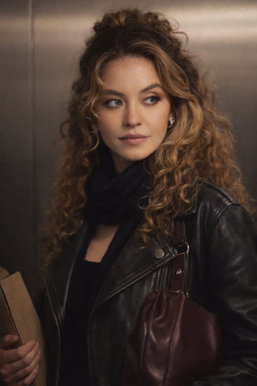 A detailed image generation prompt designed for the Gemini Nano Banana Pro model, focusing on creating a cinematic indoor portrait of a young woman with specific styling, lighting, and textural details, set against a metallic elevator background.