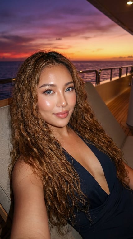 A detailed JSON prompt for generating a cinematic portrait of an adult woman with a Korean-inspired aesthetic, reclining on a sun lounger on a luxury yacht in the Caribbean Sea during golden hour. It specifies physical attributes (extremely long caramel hair, blue-gray eyes) and a dramatic sunset sky palette (purple, red, orange).