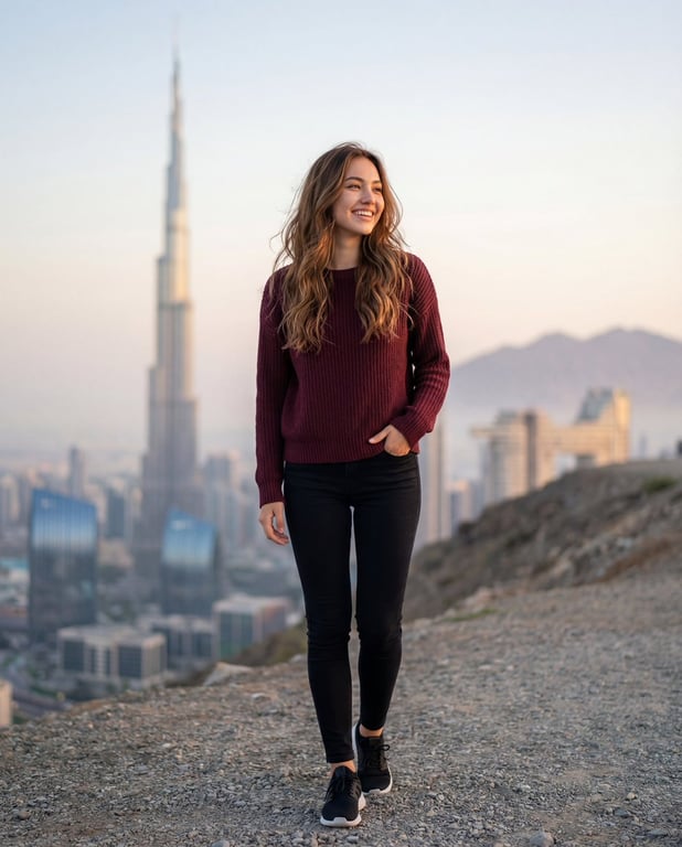 A JSON prompt for generating a high-impact cinematic lifestyle portrait. It requires 100% match to a reference image, featuring a woman in a sweater and jeans in front of the Dubai Burj Tower. The prompt emphasizes shallow depth of field, 85mm lens characteristics, and professional cinematic color grading.