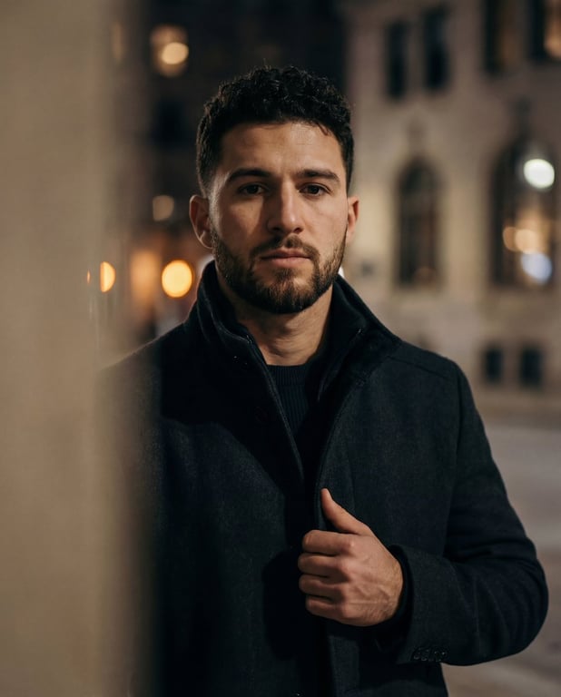 A highly detailed, structured prompt for generating a cinematic, low-key medium close-up portrait of a masculine-presenting subject in an urban nighttime setting. The prompt specifies technical aspects like shallow depth of field, high contrast, soft frontal lighting, and a subdued color palette of blacks and grays, aiming for a moody, introspective, modern noir aesthetic.