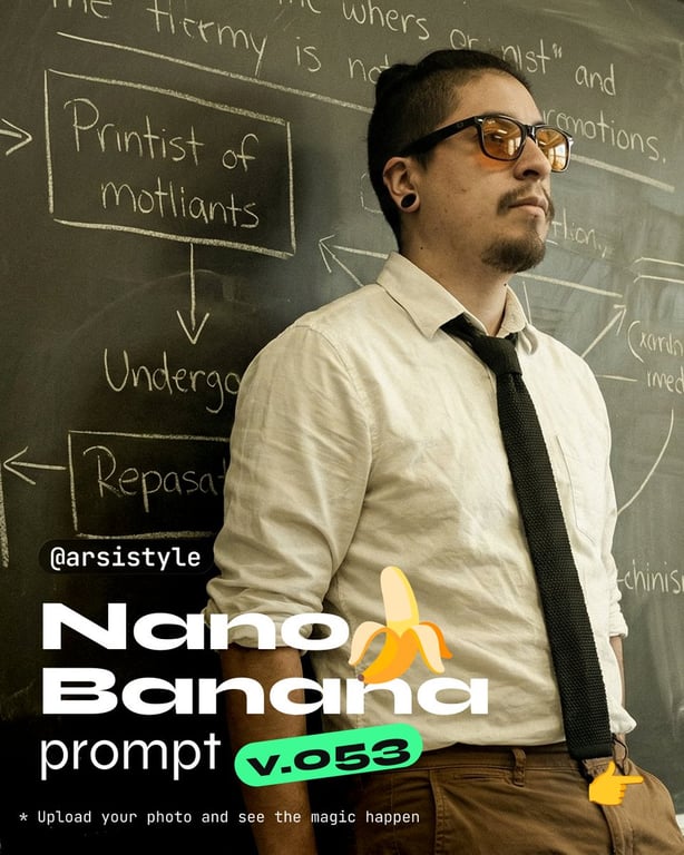 A detailed prompt for Nano Banana Pro (v.053) to generate a cinematic medium shot of a subject leaning against a black chalkboard covered in writing, specifying clothing, lighting (soft, diffused, medium-key), and color grading (warm, desaturated sepia with a greenish-yellow tint).