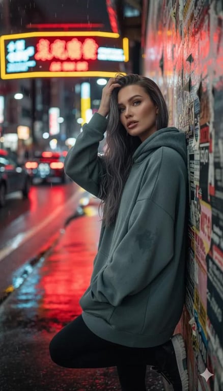 A prompt for Nano Banana Pro to generate a high-resolution, cinematic night portrait in an Asian city setting (Tokyo/Seoul/Hong Kong vibe), featuring a woman in a damp hoodie illuminated by dramatic red and yellow neon reflections on wet pavement, with strict instructions to preserve the facial features from the reference photo.