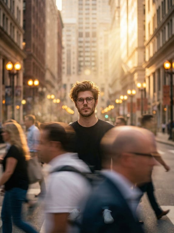 A detailed prompt for a cinematic, ultra-realistic portrait of a young man standing still in a busy city street during golden hour, using long exposure to create motion blur in the crowds, emphasizing dramatic lighting, shallow depth of field, and a melancholic, editorial fashion photography style.