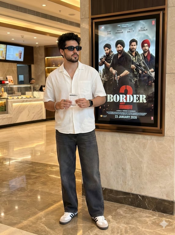 A detailed JSON prompt for generating a full-body cinematic portrait of a stylish young man in a luxury cinema lobby, emphasizing identity lock (face must remain 100% identical to the reference photo). The scene includes specific details about the outfit, the background environment (marble floor, warm lighting), and a movie poster for '{argument name="movie title" default="BORDER 2"}' clearly visible next to the subject.