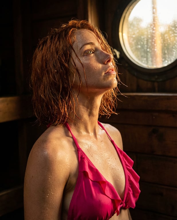 A JSON prompt for Nano Banana 2 to generate a dramatic cinematic portrait of a young woman with short wet red hair, wearing a pink ruffled swimsuit, looking up toward golden sunlight streaming through a porthole window inside a wooden cabin, emphasizing moisture and atmosphere.