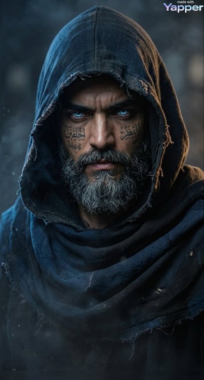 A highly detailed prompt for Google Nano Banana 2, generating an ultra-realistic cinematic portrait of a rugged, middle-aged hooded warrior with icy-blue eyes and a salt-and-pepper beard, featuring dark Arabic calligraphy tattoos and dramatic cold blue lighting, requiring a reference image for facial features.