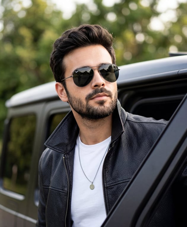 A detailed prompt for nano-banana-pro to create a high-resolution, cinematic portrait of a sophisticated man wearing a black leather jacket and Ray-Ban aviator sunglasses, leaning out of a dark vehicle, set against a soft-focus natural background.