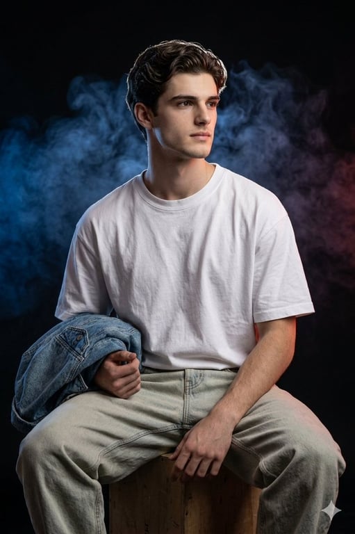 A detailed prompt for Gemini Nano Banana Pro to generate a highly realistic cinematic portrait of a young man, preserving facial identity from a reference photo, set in a studio with dramatic colored smoke effects.