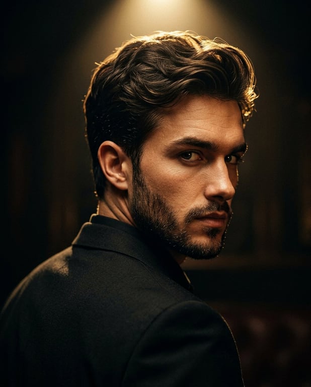 A prompt for Google Nano Banana Pro to generate an ultra-realistic cinematic portrait of a stylish man. The focus is on dramatic lighting (chiaroscuro, spotlight) creating a golden halo effect, and a sharp, intense look towards the camera.