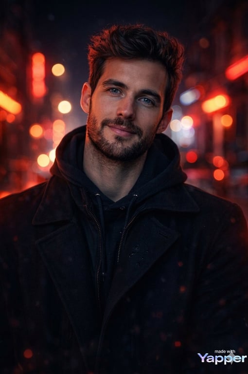 A detailed JSON prompt for generating an ultra-realistic cinematic portrait of a confident man with specific physical features and clothing, set against an urban street background with dramatic red and orange neon lighting.