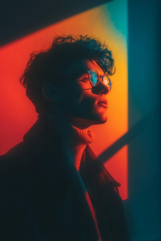 A prompt for generating a cinematic, moody editorial portrait of a person wearing glasses, dramatically lit by geometric window light that casts strong red, orange, and teal color contrasts and hard-edged shadows across the face and background.