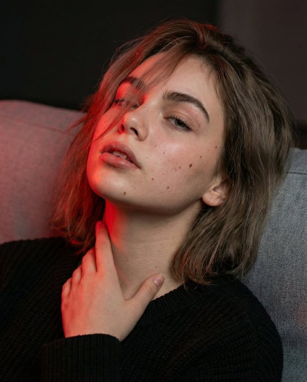 A prompt for Nano Banana Pro on Google Gemini to create an ultra-realistic cinematic close-up portrait. It mandates a strict identity lock to preserve the face 100% identical to the uploaded reference image. The scene features the subject reclining with dramatic red lighting from the left side, casting a bold red glow across half the face, emphasizing natural skin texture and high contrast.