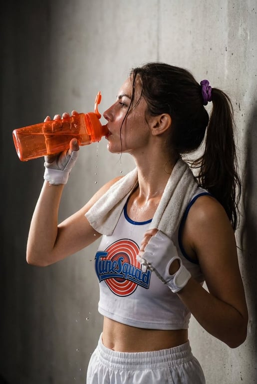 A highly detailed, structured prompt for Nano Banana Pro to generate an ultra-photorealistic, high-contrast cinematic portrait of a young woman in retro sportswear drinking water, emphasizing sweat, texture, and dramatic lighting.