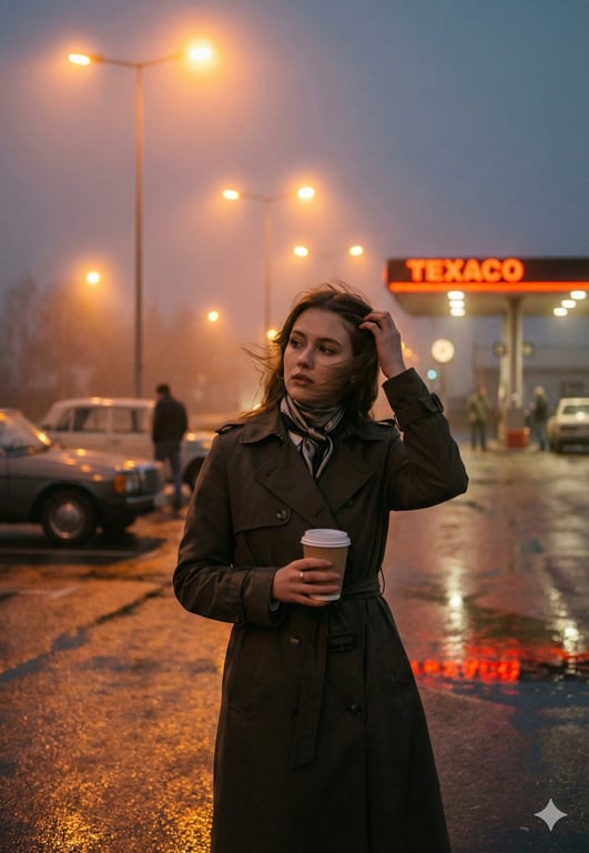 A detailed prompt for generating a cinematic, melancholic portrait of a young woman at a Texaco gas station at dusk. The prompt focuses on roadside realism, natural textures (skin, worn trench coat), practical lighting from the canopy, and a specific color grade (warm amber highlights against cool blue-gray sky) to create a sense of late-night solitude.